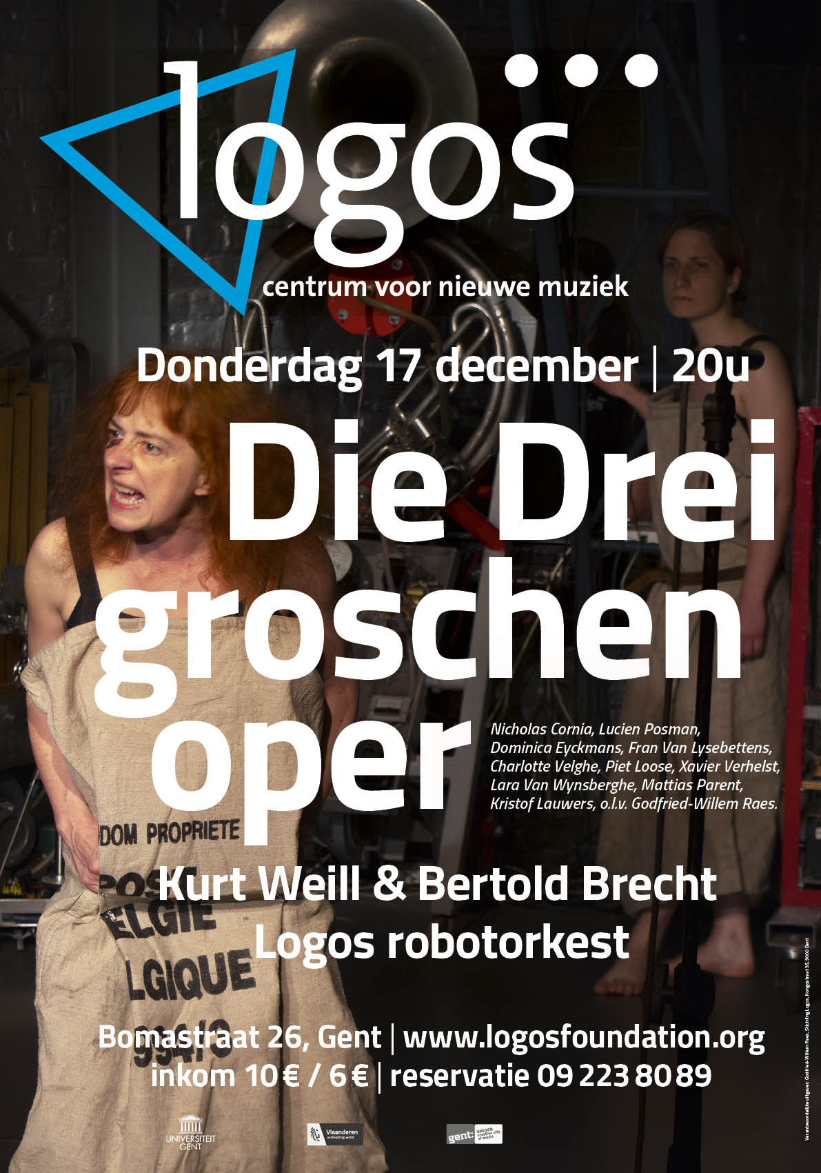 voorzien in libretto en partituur. Onze De versie zoals Logos die voorstelt is het resultaat van een minutieus artistiek onderzoeksprojekt rond het integraal realiseren en rekonstrueren van historische 20e eeuwse muziekliteratuur die in de tijd waarin ze ontstond niet praktisch realiseerbaar was, maar het met de middelen die ons vandaag ter beschikking staan perfekt mogelijk wordt. Eerdere door ons opgezette projekten in die zin waren 'Les Noces' van Igor Strawinsky en 'Ballet Mechanique' van Georges Antheil. Dit onderzoek kadert in ORCIM, een onderzoeksprojekt van het Orpheus Instituut en Stichting Logos. De door Kurt Weill uiteindelijk gekomponeerde muziek voor Die Dreigroschenoper, is geschreven voor een orkestje dat bestond uit niet meer dan 7 musici, die echter de meest onwaarschijnlijke instrumentenkombinaties te spelen kregen: