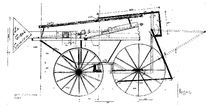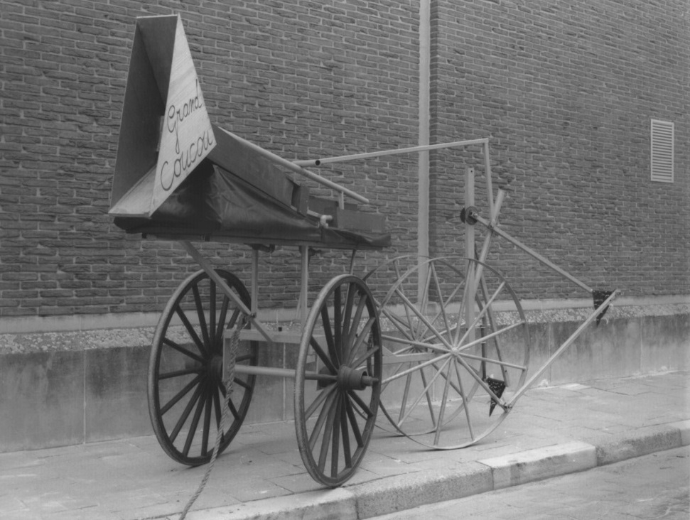 Het voorste wielenkoppel is afkomstig van een oude koets (16 spakige houten wielen van 117 centimeter diameter) , terwijl het achterste paar volkomen van eigen makelij is. Hiervoor verbeterden we het elegante een veerkrachtige 6 spakig ontwerp van de 'Carossa dell Impossibilita dell unisono' uit 1995 (twee van deze wielen sneuvelden in een vorige stoet onder het sadisme van de Gentse kasseien...) door het aantal spaken te verdubbelen tot 12 en de diameter te vergroten tot 126 centimeter. Via een excentrisch punt op een spaak van elk achterwiel -onderling een halve cirkel uiteengeplaatst- en een stangenmechanisme wordt dan een zware wals in beweging gebracht die de blaasbalg op een neer doet gaan. De achterwielen zijn dicht bijeen geplaatst en draaien om een gemeenschappelijke vaste as. Dit is het soort mechanisme dat ook in motoren wordt gebruikt voor de overbrenging van de zuigerbeweging op een roterende as. Wie het mechanisme aan het werk wil zien, kan steeds ons demo programma 'wielen.exe' via de voorziene link runnen, mits hij tenminste een PC heeft. Voor de opname van in in 1998, drongen enkele konstruktieve wijzigingen zich op. Zo werd de Coucou voorzien van een zadel, gemonteerd bovenop de gehele konstruktie. De berijder kan nu de dubbele balg met de voeten zelf bedienen. Het mechanisme op de achterwielen wordt nu gebruikt voor de (manuele) aandrijving door twee duwers. Tevens werd nu een stuurstang, bediend door een stuurman, voorzien. Tussen de voorwielen hangt nu het grote rode hart van de koekoek.