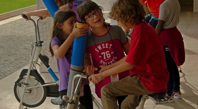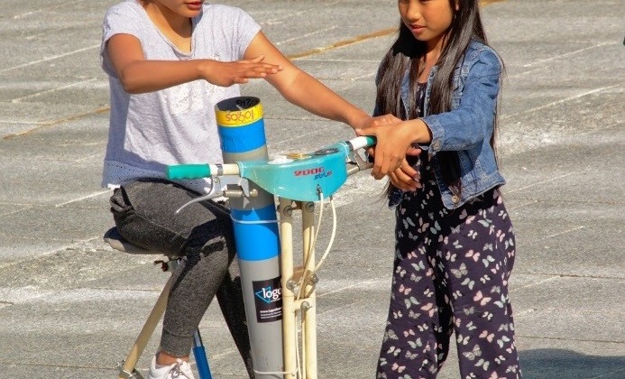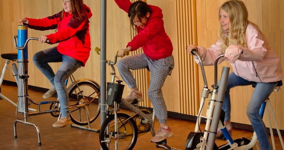 When we built and realized Godfried-Willem Raes' second symphony, scored for 12 to 24 singing bicycles we have always been confronted with the sheer impossibility to make a decent recording of the piece. By the very concept of the moving bicycles through a given city, any listener can at the most get to hear a snapshot of the symphony. Just enough to get intrigued. If you were, as a performer on one of the bikes at the other hand, it wasn't possible to hear the symphony as a whole, as you got to hear mostly your own 'instrument'. In 2015 we were commisioned an interactive musical installation project for the Bing Bang Festival and we took up the singing bicycles concept again, applying it this time to hometrainers.