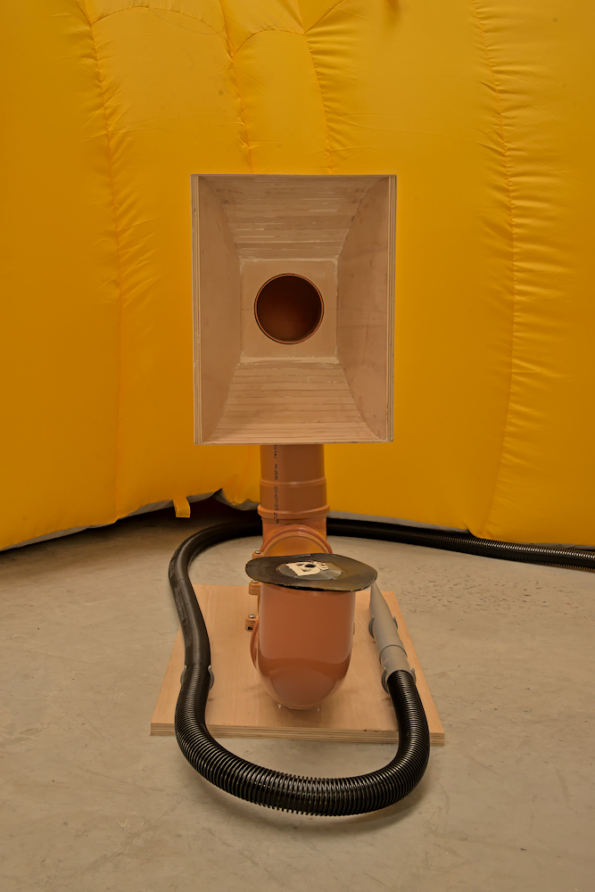 Susurrus requires a large and rather quiet indoor location. The site for the installation measures at least 10 by 10 meters. The height of the room is at least 2m70. A smooth floor is necessary to avoid tears in floor of the large inflatable structure. In principle, the standard lighting of the room is sufficient. Additional spherical lighting is welcome. The two wind machines (blowers for the air supply of (1) the air bounce house and (2) the four large sound objects) are preferably placed at a distance from the air bounce house (7 meters). If possible, they can also be placed in an adjacent room, to minimize the noise of the blowers themselves. The organizer provides two (normal) wall outlets (220 V) for the power supply of the wind machines.
