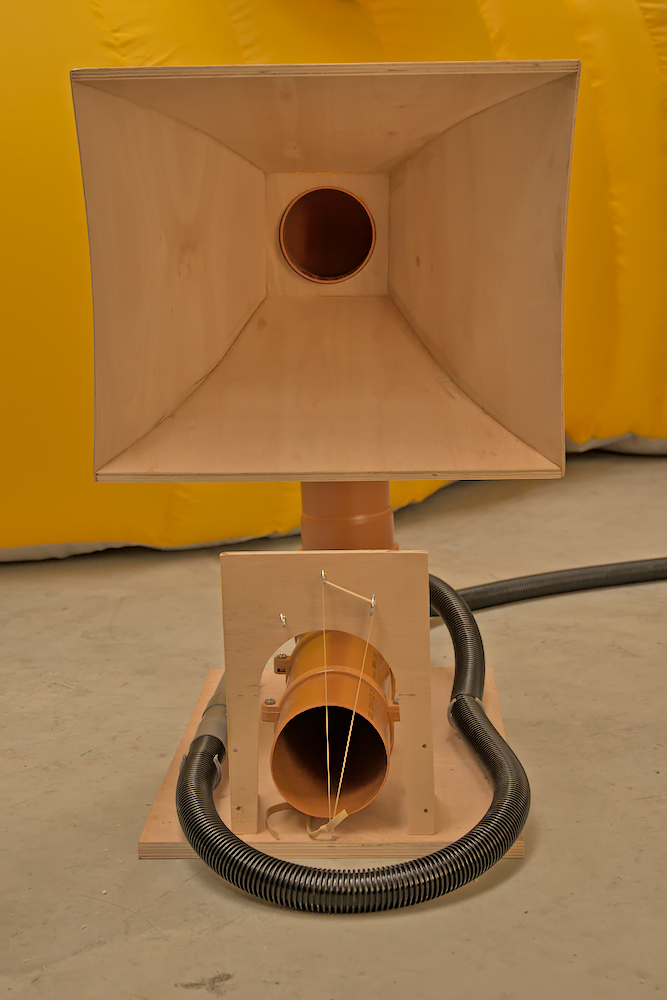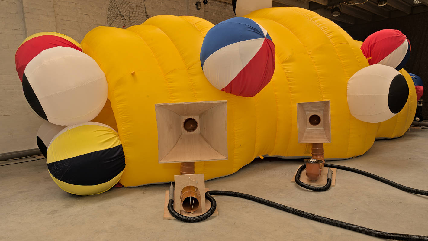 Susurrus is an interactive installation in which children and adults experiment with air-blown sound objects. At the center is a colorful, inflatable caterpillar with four large sound objects: two large pan tube flutes (long PVC pipes that are blown from a 90 degree angle - like a pan flute); the rubber blower (a blower makes rubber bands vibrate like a kind of vocal cord); the noise gramophone (an instrument with an acoustic horn in which the air whistles through a small cavity in an LP or CD). Four long tubes connected to a compressor provide the air supply.