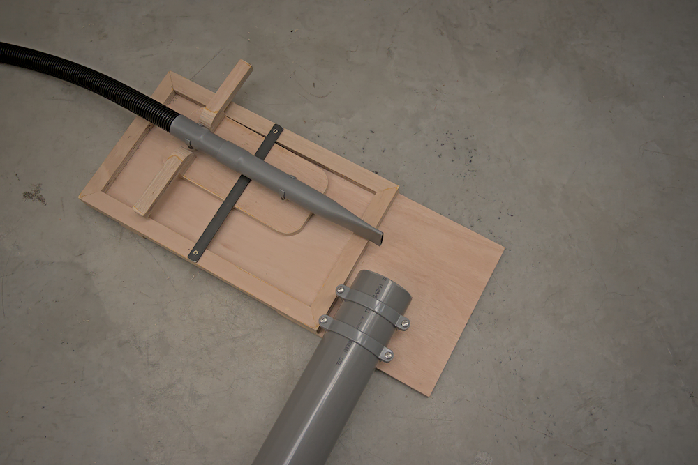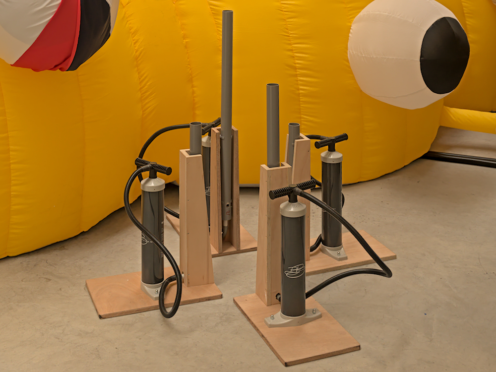 Vervolgens bekeken we welke van de kleinere windinstrumenten aan de buitenkant van de opblaasbare installatie opgesteld kon worden en stelden we eind 2023 een eerste testversie van de nieuwe installatie voor. Daaruit bleek dat de kleinere blaasinstrumenten aan de buitenkant te breekbaar waren voor een installatie, bestemd voor kinderen. Ook waren ze te stil tegenover de andere instrumenten in en rond het luchtkasteel. Van één buiteninstrument, een orgelpijp die door een voetpomp werd geactiveerd, maakten Hans en Mattias een stevigere versie, nu met handpomp. Mattias gebruikte zijn expertise als instrumentbouwer om deze pijpen zo veel mogelijk boventonen te laten produceren (door de orgelpijp een asymmetrische lipopening en dus een 'onstabiele' toon te geven). Van deze handpomp-orgelpijpen maakten we 8 exemplaren met verschillende toonhoogten; elke handpomp past bij één van de boventonen van de panbuisfluiten (en kan daar dus een eigen eigen boventoonreeks bovenop spelen). Vervolgens plaatsten we deze handpomp-instrumenten samen, in een groep van vier, omdat we merkten dat dit het spelplezier bevordert (in vergelijk met een verspreide opstelling rondom het luchtkasteel). Na een test met een klas kinderen van een Gentse school in het voorjaar 2024 bleek dat deze opstelling alvast de juiste keuze was.