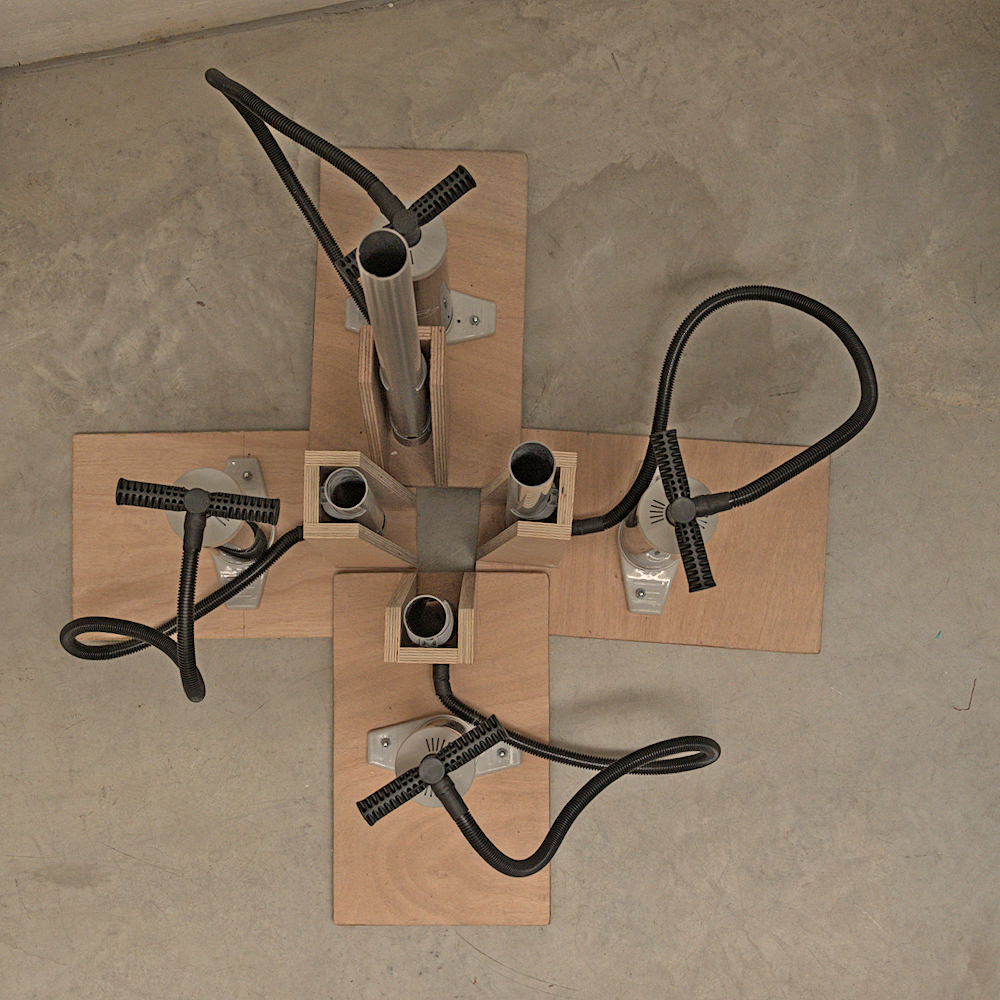 There are eight smaller sound sculptures surrounding the pan tube flutes. With a hand pump you can blow a short organ pipe. By varying the air pressure, the different overtones become audible. The hand pumps are arranged in groups of four next to a long pan tube flute and are based on its overtones. Visitors can try out the different sound possibilities on their own, they can also play together in groups. This creates a continuously varying interactive and acoustic sound layer.