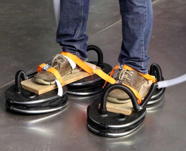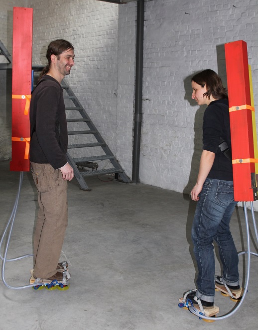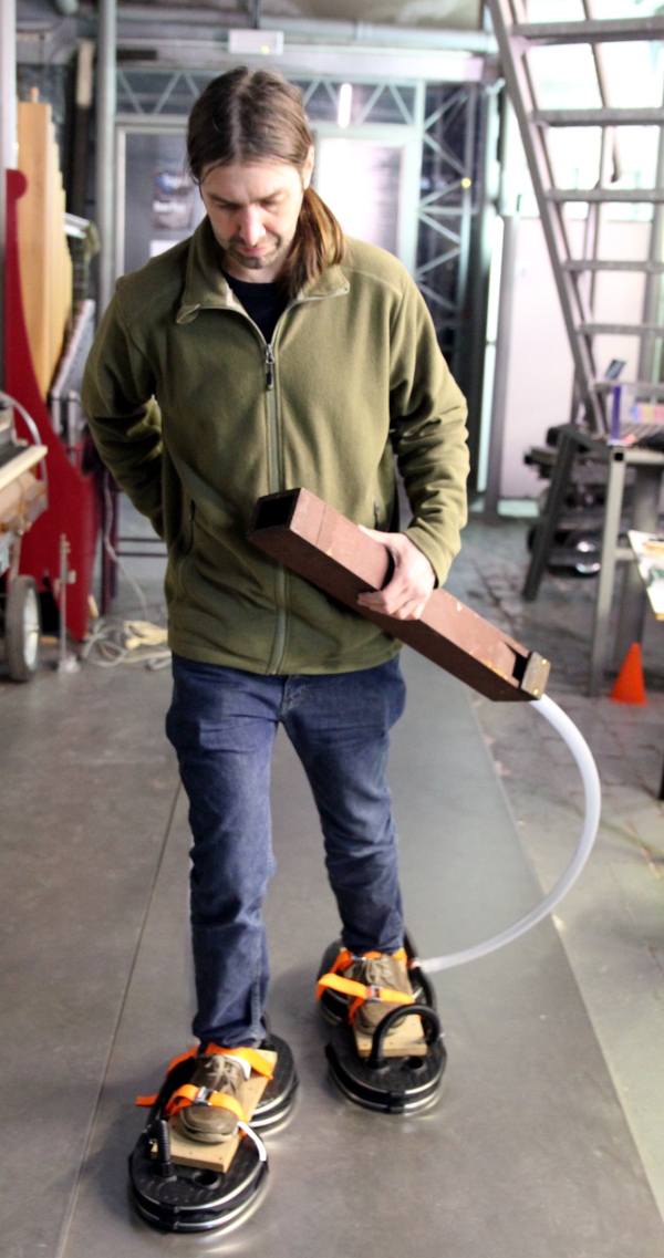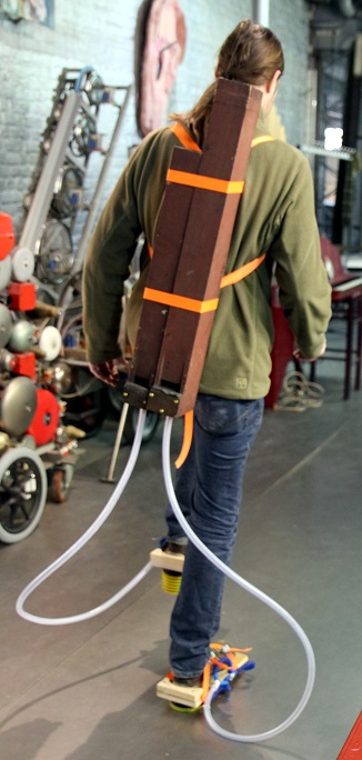- Pompschoenen: Er zullen verschillende soorten pompen moeten worden gekocht, gemaakt of omgebouwd. Er zal moeten worden nagegaan of er veren of andere mechanismen moeten worden voorzien om de lege pomp terug lucht te laten zuigen. Er zullen verschillende methodes moeten worden uitgedacht en uitgeprobeerd om de pompen aan de voeten van de kinderen te bevestigen. Er kan gewerkt worden met plankjes die met behulp van riemen of rekkers aan de schoen worden vastgemaakt. We kunnen de pompen ook definitief aan speciaal daarvoor voorzien schoeisel bevestigen of experimenteren met bevestigingsmechanismen die gebruikt worden in sporten zoals snowboarden, rollerbladen, of ski�n. De voor- en nadelen zullen moeten worden afgewogen en afhankelijk van parameters zoals comfort, luchthoeveelheid en veiligheid zal worden beslist welke pompschoenen in aanmerking komen.