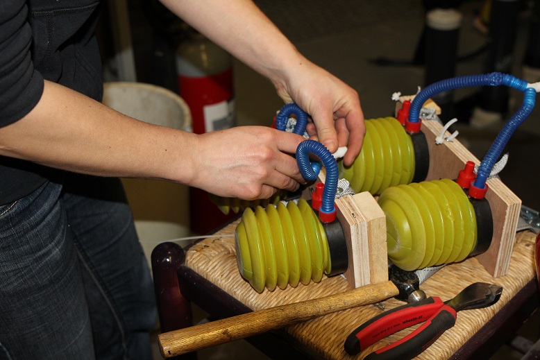 - Slangen en koppelstukken: Er zullen verschillende soorten en materialen van slangen en koppelstukken moeten worden uitgetest. De slangen moeten de lucht van de pompschoenen naar de pijpen leiden. Ze moeten makkelijk aan te sluiten zijn en tegelijkertijd de nodige stevigheid bezitten. Er moet ook rekening gehouden worden met de aanpasbaarheid van de lengte van de slangen, zodat zowel grote als kleine mensen de installatie comfortabel en veilig kunnen bespelen.