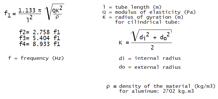 As we use the same material for all tubes (aluminum, AlMgSi 0.5, with density 2.699 kg / liter) and we also keep the thickness the same (30 mm / 20 mm), we can simplify the formula. The part under the square root becomes a constant. The factor 1.133 given by Olson (and blindly taken over in many textbooks on acoustics) , after our measurements for note 84 (f=1046Hz) appears to be 1.203.. The deviation is a lot larger than what can be attributed to the precision of our measurements... Furthermore, the value decreases as the tubes become shorter.
