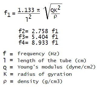 The 'constants' in the textbook formula are clearly a function of pitch. We do not have a sound explanation for this result. Maybe the force exerted on the tube by its weight when suspended, contributes to the deviation? Very unlikely. Maybe the propagation speed of sound/vibration itself is a function of frequency? Maybe, Olson's formula was never empirically checked? We guess the latter, as nowhere we found empirical data...