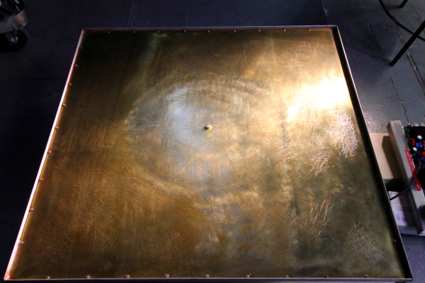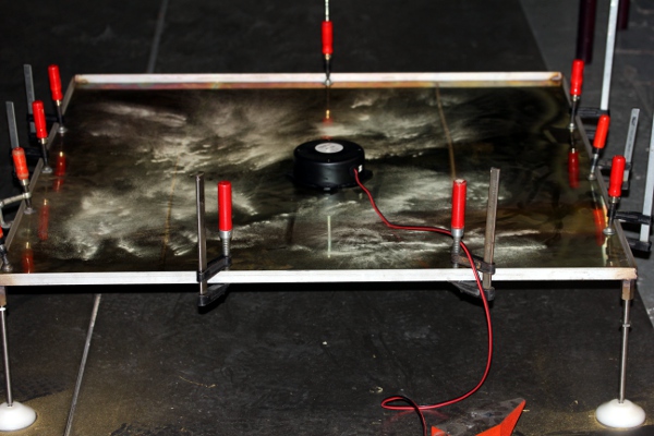 It is important to keep the brass surface of the plate neatly polished. Placement of a video camera and projection on a large screen is highly recommended. For the lighting, a grazing light should be used. Interactive set ups, where the vibrations can stem from a microphone operated by visitors or workshop participants are perfectly possible. Insertion of a limiter/compressor in the signal path is advised.