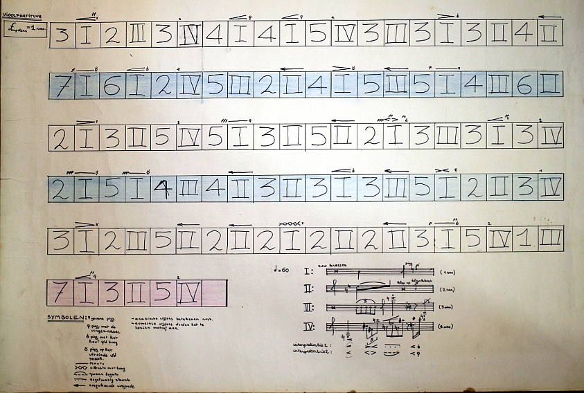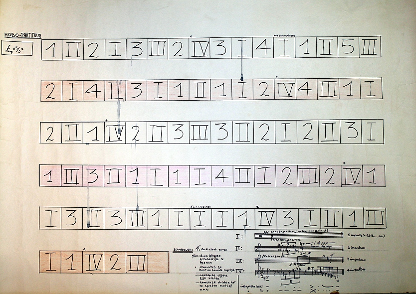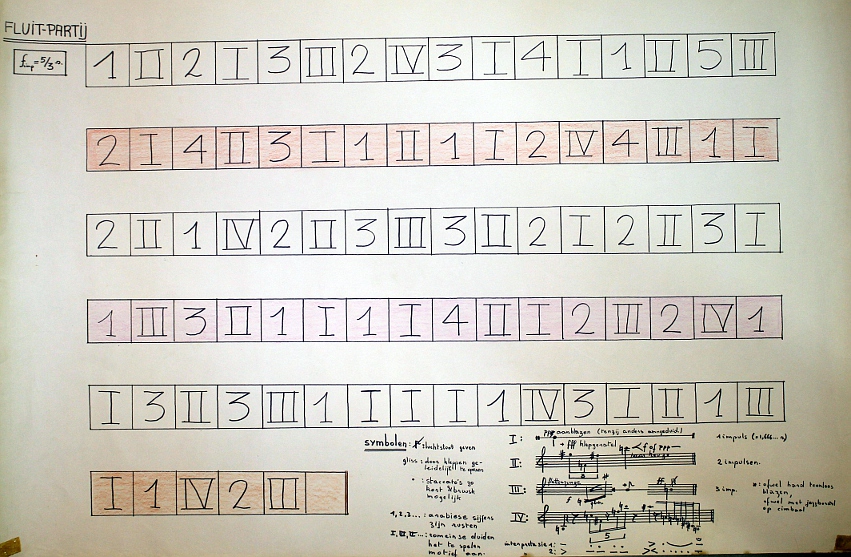 Hun partituur is geschreven op een groot vel papier en bestaat uit vier à zes rijen van twaalf tot twintig vakjes waarin cijfers geschreven staan. Er vallen twee soorten cijfers te onderscheiden: arabische (gewone) die de rusten en romeinse, die het te spelen motief aanduiden. Elkeen beschikt immers over vier, als I II III IV genummerde motieven, die door een gelijkwaardige vormingswet werden opgebouwd. Staat er nu bijvoorbeeld in de vakjes geschreven: 3 I 2 IV... dan betekent dit drie impulsen wachten, vervolgens motief I spelen, twee impulsen wachten, motief IV spelen, enz...