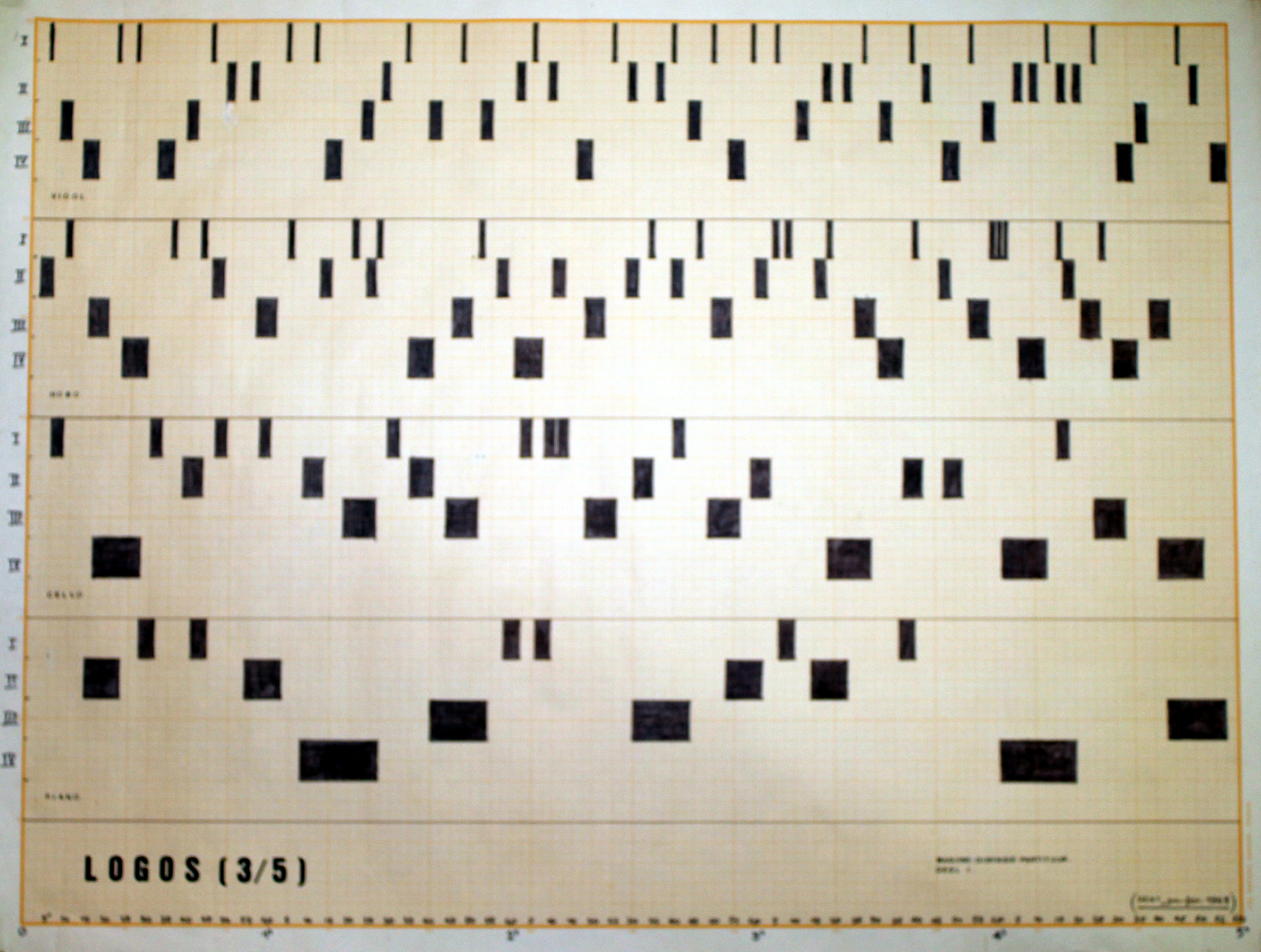 Geleidelijk kwam ook een konventionele ritmische notatie in zwang, de mensurele notatie, die eveneens naast de voordelen van grotere nauwkeurigheid in schrijfwijze en uitvoering, het grote nadeel met zich meebracht van een werkelijke ritmische verarming. De ritmen die wij kennen uit onze klassieke partituren, zijn vrij eenvoudig te noemen. Tot in het begin van de twintigste eeuw voldeed deze schrijfwijze dus blijkbaar goed. Doch, in dat fameuze begin der twintigste eeuw nu, begonnen voorgoed de moeilijkheden met onder andere ons muziekschrift: de Amerikaanse neger leerde de blanke langs zijn jazzmuziek wat ritme is! Vele komponisten hebben dan ook terdege van die informatie gebruik gemaakt in hun komposities (o.a. Stravinsky in Le Sacre du Printemps, in L'Histoire du Soldat, enz...) en ondervonden daarbij de totale onmogelijkheid om de rijke negerritmen met onze abstrakte notaties op papier te brengen. Ook op melodisch gebied werden we (allen?) losgeschud uit de verstarring van de akademische neostijlen: grote namen als Arnold Schönberg zagen in dat toonladders rotte kadavers geworden waren, van uitputting gestorven na de zwanenzang van de woeste Wagner, een zwanenzang van invalide toonladders. Schönberg vond het dodekafonisch stelsel, terwijl Stravinsky ons zijn ritmen in de pap kwam brokkelen. Vandaar gaat de evolutie zeer snel: Alban Berg werkt met Anton Webern en anderen het dodekafonisch stelsel uit terwijl ze hun muziek met de nieuwe ritmische elementen doorspekten. Habà en Busoni ijverden voor kwarttoonsmuziek en totale kromatiek. Meer en meer getuigen onze notenbalken ons, dat ze een waar anakronisme vormen; en de evolutie ging almaar verder... de partituren werden almaar moeilijker en onuitvoerbaarder. Mensen als Stockhausen zochten naar nieuwe notaties (o.a. in Plus - Minus) die echter alleen zeer ingewikkeld zijn en waarbij bij elke partituur meer bladzijden uitleg over tekens en symbolen gegeven wordt dan er muziek in geschreven staat. Om dit nu te vermijden, dacht ik een systeem uit dat met mogelijke nadelen, het grote voordeel inhoudt, de meest komplekse ritmische strukturen ten gehore te brengen, zonder dat de uitvoerende muzikanten daar moeilijkheden bij ondervinden. LOGOS (3 / 5) is een audiovizuele triptiek voor hobo, viool, cello en piano. De vier uitvoerders spelen elk in een verschillend tempo dat geen veelvoud vormt met de andere tempi. Deze tempi verhouden zich onderling als twee vaste priemgetallen.