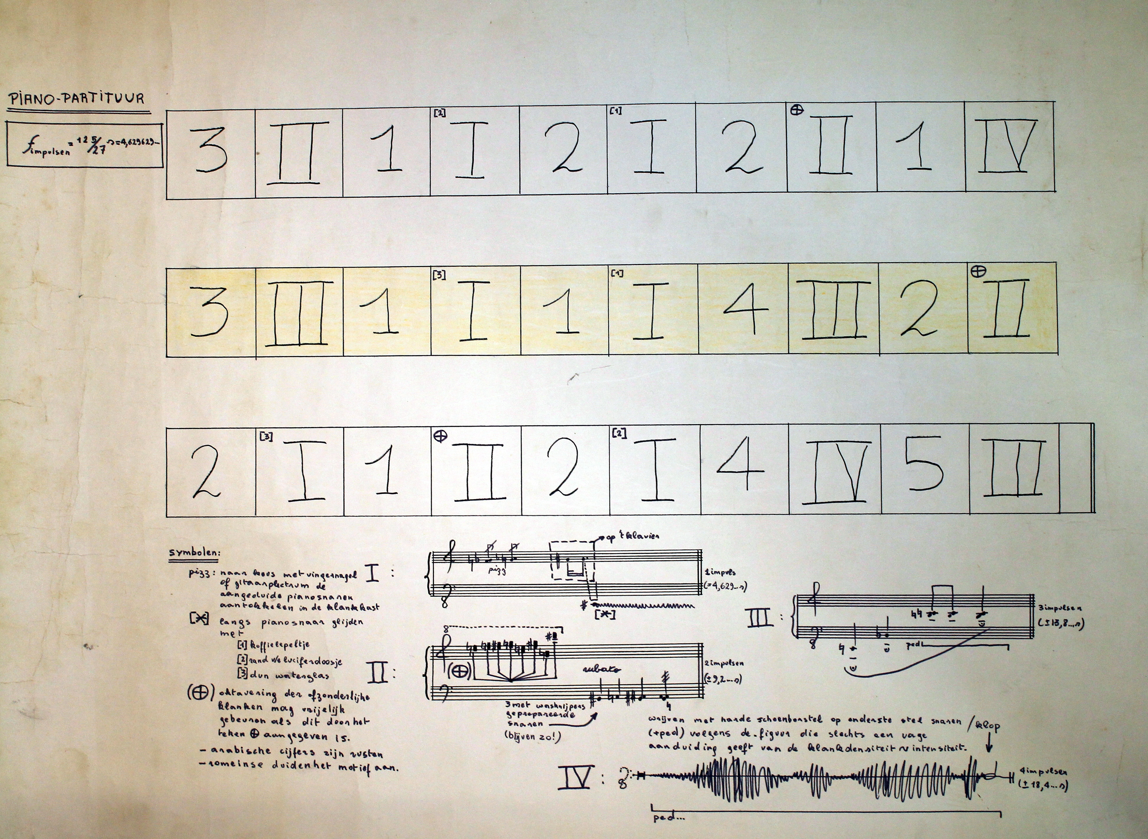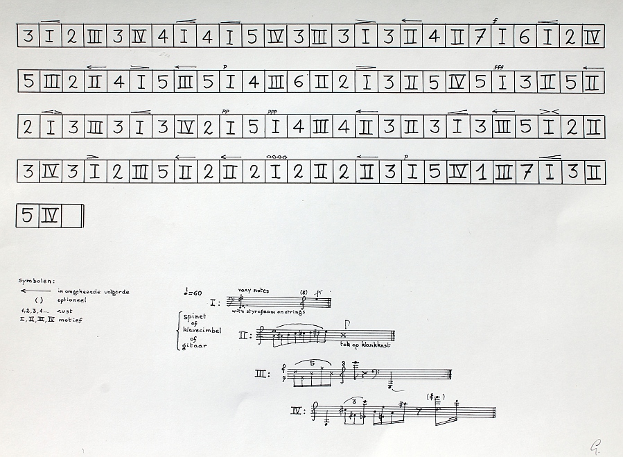 Doorheen mijn gehele kompositie worden allerlei geluiden gebruikt, die op het eerste gezicht misschien weinig met muziek te maken hebben. Ik zeg wel op het eerste gezicht, want de mogelijke negatieve houding daartegenover berust alleen op een ernstig vooroordeel en een gebrek aan muzikaal inzicht. Waarom immers zouden we de pianogeluiden beperken tot deze die we door middel van de toetsen kunnen verkrijgen?