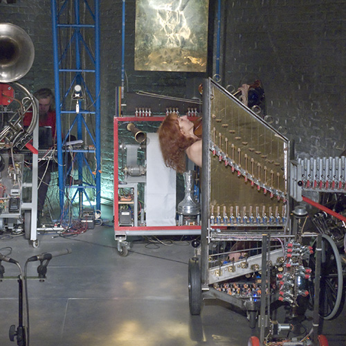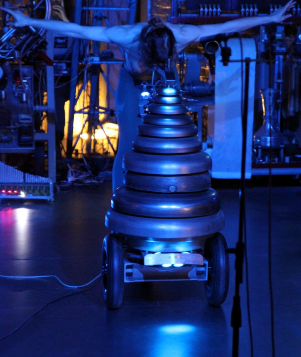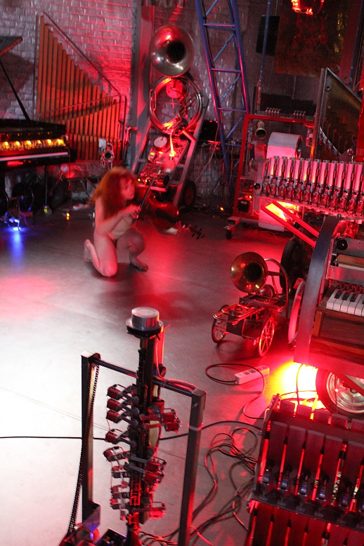 These robots constitute almost the entire robot orchestra built by the author up to the year 2024. The complete setup on stage takes at least 140 square meters. The naked dancer(s) should be placed central, surrounded by the robots as well as the gesture sensing system.
