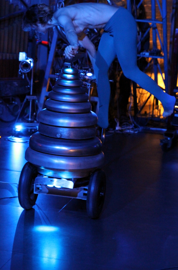 This study uses the namuda gesture recognition engine to create a serial composition in real time scored for a very limited subset of our robot orchestra. <Bomi> -the main voice- with accompaniment voices scores for <Toypi> and <Aeio>, all controlled by a viola playing dancer. The piece was written for Dominica Eyckmans and premiered on september 16th at the Logos Foundation. Here some pictures of this performance: