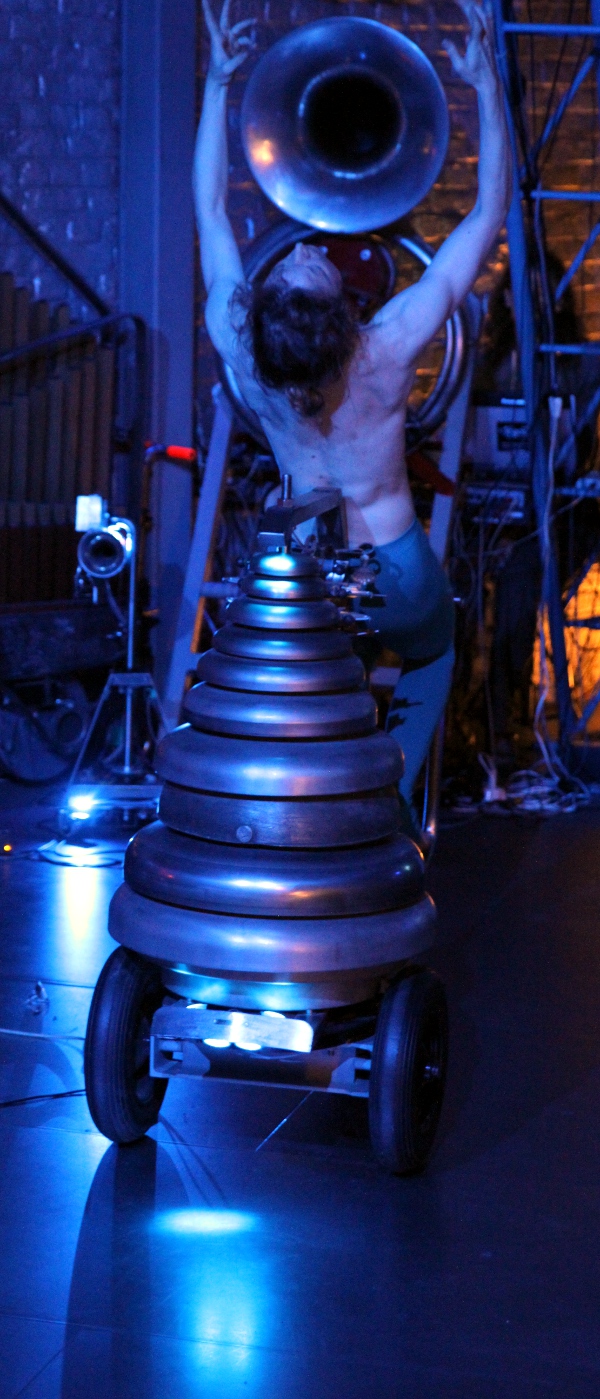 This is a full evening dance production with dancers Dominica Eyckmans, Emilie De Vlam and the author. The productions uses some 60 robots and has musical as well as code contributions by Kristof Lauwers, Xavier Verhelst and Lara Van Wynsberge. Premiered july 19th 2016 and presented again july 20th and 21th at Logos Foundation. There is a special place for the newly reborn <Flex> robot, a double singing saw, in this production.