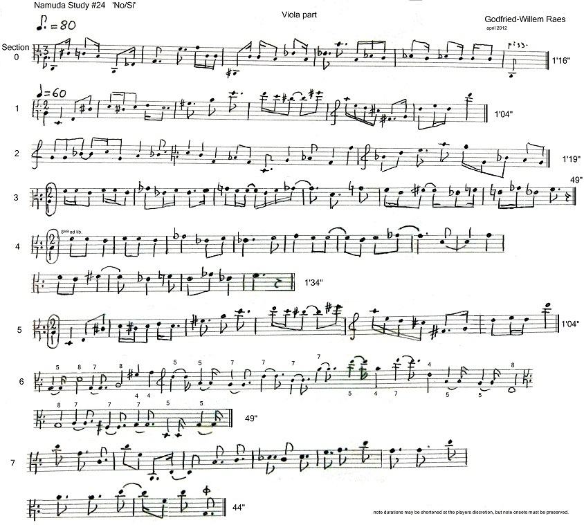 Namuda forms in fact a collection of pieces that can be performed alone or in a sequence, as a suite. The 'scores' are in general completely embedded in the software. The choreography is laid down in notes and descriptive plots. Some of the studies are written for a dancing musician playing an instrument. In that case there is a written out score for the instrumental part.