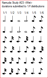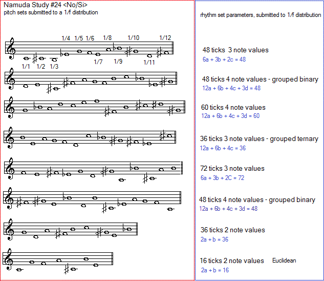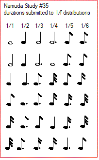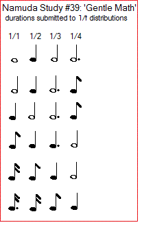 The first inspiration for this study we got after reading an article on the fine structure constant in particle physics. This constant evaluates to approximately 1/137. The fact that the denominator is a prime number intrigued us. If we do the division, we get 0.0072992700729927... Immediately we did read that as a little melodic cell: . Upon that we recalled from our math background, that in fact all rational numbers must have such a repeating sequence in the quotient 1/n. So we started an examination of the repeating part in these number series. For small numbers of decimals, it is easy to see on a pocket calculator, for larger numbers however, there is a lack of decimal positions. So, we called in our computer, but writing a simple program was just not enough, as even on a 64 bit machine, the number of digits is limited and way too small to discover repeating sequences. Thus we had to write a simple program performing the divide step by step for each digit, using a string representation of the number.This way, we are only limited by the size of the computer memory or eventually even its harddisk. Large sequences are difficult, if not impossible, to see on the eye. So we needed to write a simple pattern recognition program to find repeating sequences in very large number series. Examining tables of such patterns, we noticed that the size of the repeating pattern was allways smaller than n, the number used in the quotient 1/n. Is this a math law? If it is, it could speed up calculations seriously. We posted the question on Facebook and quite some smart friends familiar with number theory reacted. Indeed, our assumption proved right. We wrote and debugged a function to perform these calculations and added it to our library in GMT. Not only this became the base of the algoritmic composition program underlying this namuda study, but also we started working on some pieces using these rational melodies in counterpoint and canonic variations.