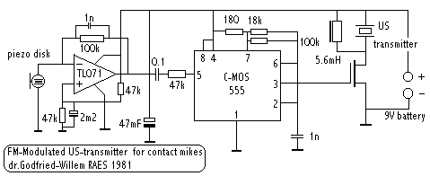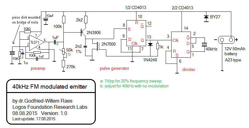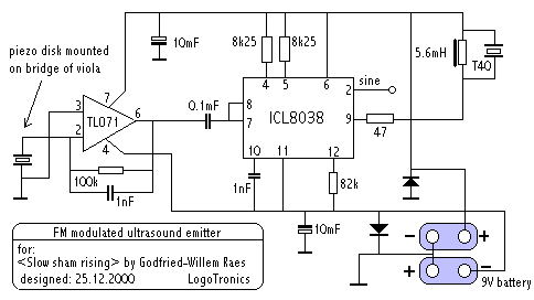 This small circuit should be mounted on the tailpiece of the viola. The battery pack (two 9V alkaline batteries, but two 5.6V photocamera type batteries could be used as well) may be worn as a necklace, a belly or arm strap, a head ornament or whatever idea the performer may show up with. Batteries are just too heavy to be safely mounted on the viola as well as the circuit… For every performance a set of fresh batteries should be used. Operation of the ICL8038 is only guaranteed from 10V supply voltage on. Thats why we did not design a single supply circuit which would have enough with a single 9V battery... The capacitor on pin 10 (1nF) should be trimmed such as to obtain 40kHz, without modulation on the FM input. An alternative circuit, using only a single 9V battery looks like: