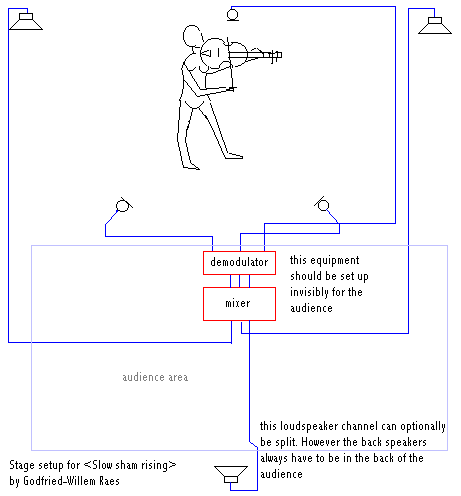 This musical input should be modulated by a shamanistic performance, involving increasing body movement . These gestures and movements will be at the same time the subtle modulating source for the musical input. The maximum frequency shift due to the doppler effect on the viola notes is in the order of 1%. So, at slow movements soft beats may be heard, slight phase shift vibrato at faster speeds. However, the movement itself will cause strong doppler shifts on the carrier wave leading to audio noise in the frequency band 0-800 Hz. High pitched doppler sounds may be produced by fast movements through the air with the bow (marked salto dell arco in the score, at the end of each bar).