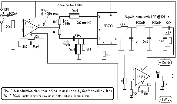 Thus the viola sound is used as a source for frequency modulation of a battery powered ultrasonic transducer. The signal is received by three transducers situated on the ground and connected to a demodulation circuit. This holosound demodulator board consists of three circuits depicted below. Note that high precision components should be used here. The input signal should not be clipping at any point. If the signals from the transducers appear clipped on the input of the circuit below, the distance between transducers and viola should be increased. If no output from a channel (not even hiss) is obtained, than the distance is so small that the input amplifiers are saturating and locking up occurs. The signals on pins 1 and 3 of the AD633 multiplier should be of equal rms voltage for proper operation of the AM/FM circuit. (Adjust for a maximum 5V rms signal on pin 6 of the OP27's). Technically speaking, the circuit is a dual slope balanced demodulator or phase detector.