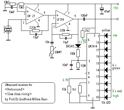 DIN connectors are used to connect the transducers to the demodulator circuit. The distance between viola and transducers should be adjusted such as to obtain only the bottom LED (yellow) or the lowest center LED's (green) lighting up. If the signal is too strong, the upper LED (red and marked high in the schematic) will be lit and the signal distorted. The output of these three demodulators (housed together in a single unit 19" cabinet) are fed to a mixer board and projected in the performance space through at least 2 but optimally 3 loudspeakers.