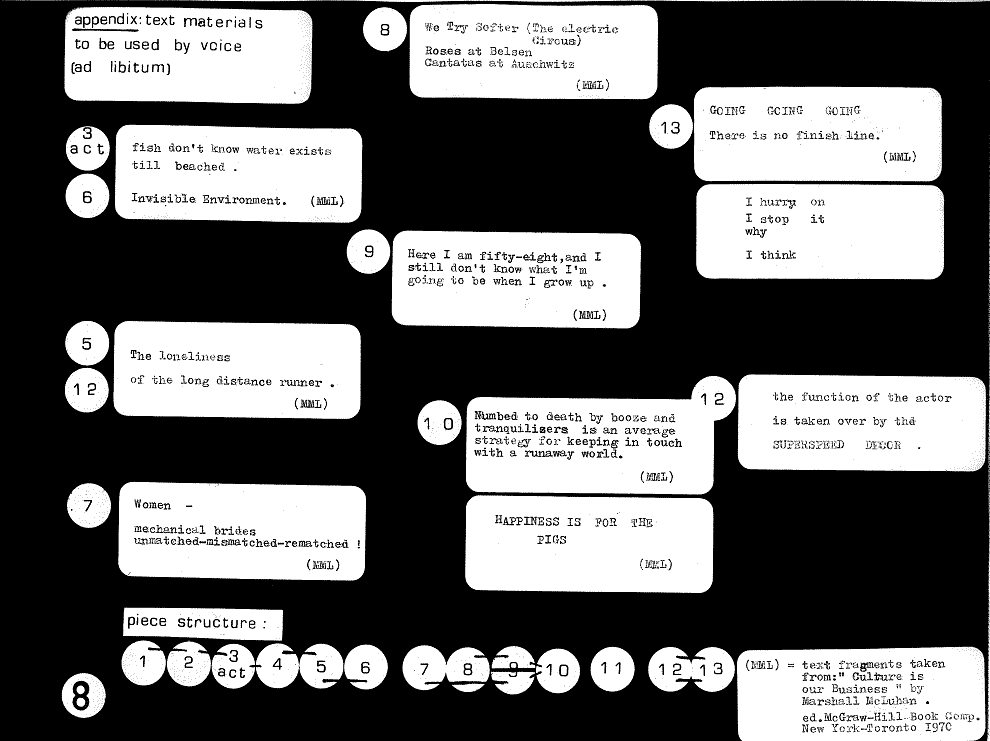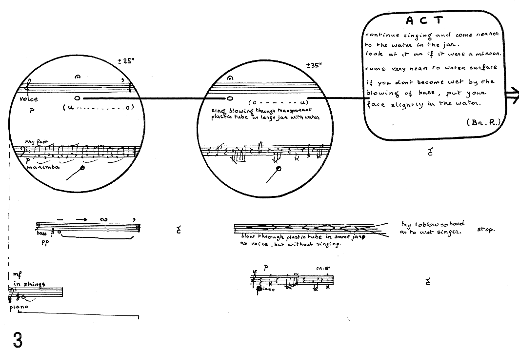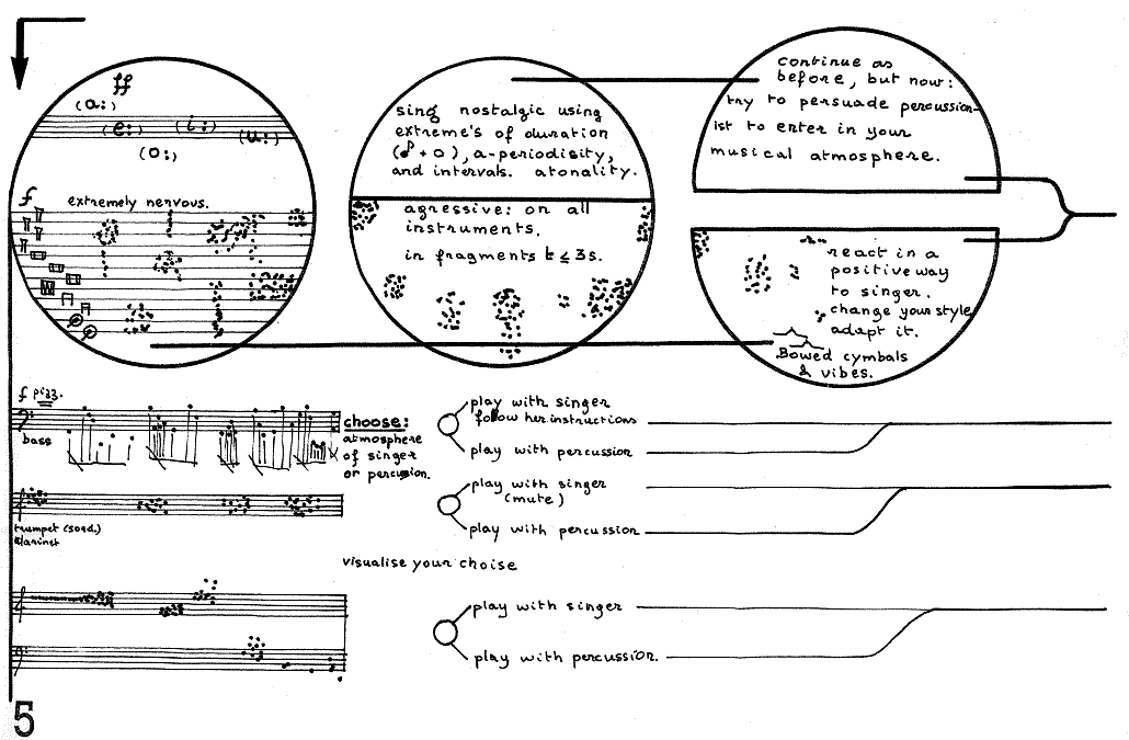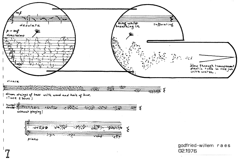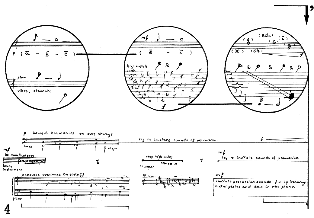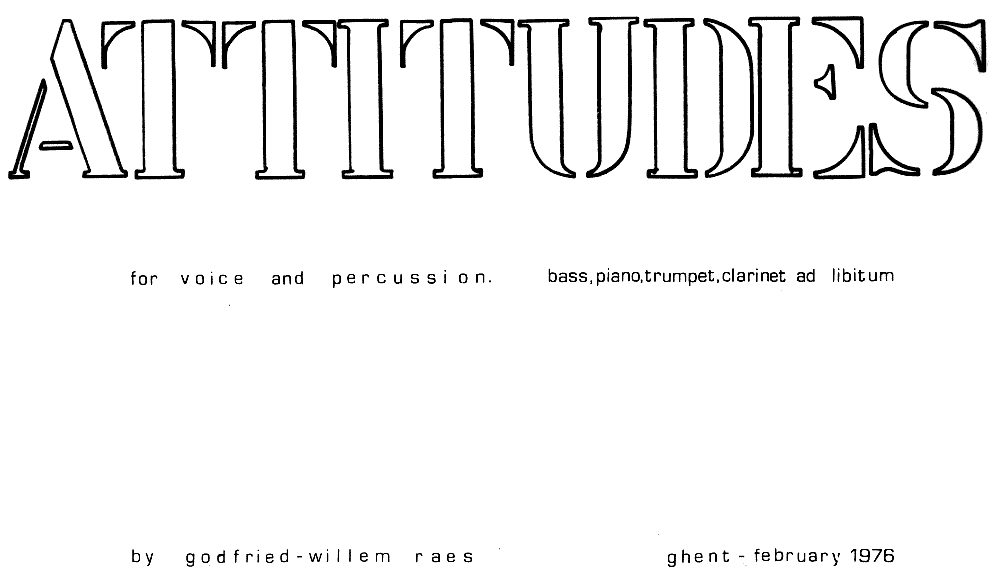 It was premiered in 1976 by Xavier Verhelst, double bass, Linda Walker, piano, the author, percussion, Moniek Darge, voice and acting, Johan Joris, trumpet. A recording is available.