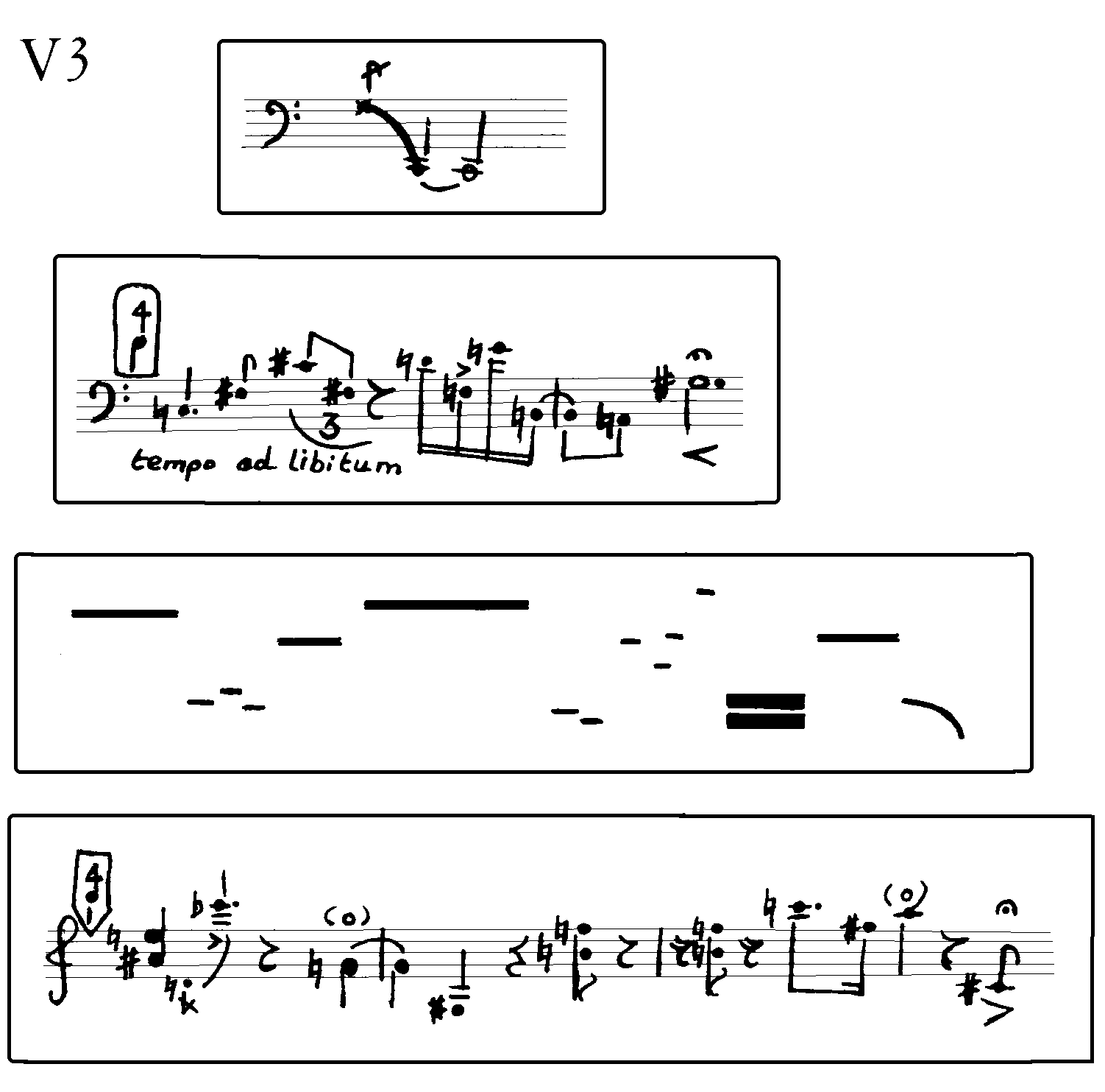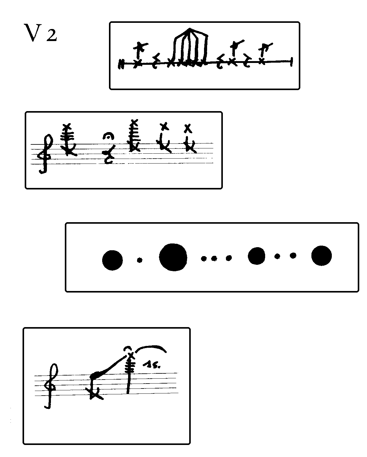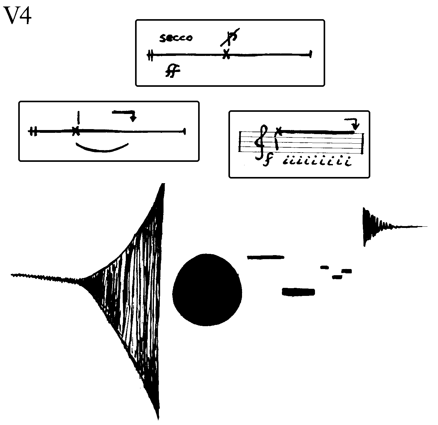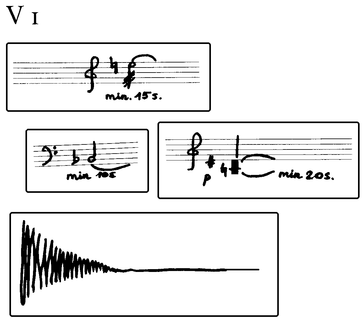 Each player is at the same time a conductor for all other players, but never for himself. There is no hierarchy between the players. The piece consists of 4 sets (V1 to V4) each containing 4 sonic elements. A fifth set may consist of sonic ideas the players can add for themselves as additional material. This fifth set is not limited and does not neccesarily have to be written out beforehand. This fifth set can be diferent for each player.