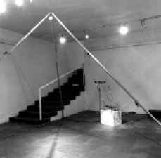 La figure imaginaire a trois dimensions reliant l'emetteur aux trois recepteurs a la forme d'un tetraedre. L'espace sorcier est symbolyse par deux cercles concentriques qui visualisent les spheres inscrites et circonscrites par le tetraedre. Des que le cercle est penetre, l'installation commence a fonctionner et le mouvement devient sonore.