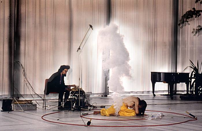 Le deuxieme acteur, guere en mouvement, est assis derriere l'installation electronique et est responsable du melange final des signaux ainsi que de la modulation de frequence de l'emetteur.