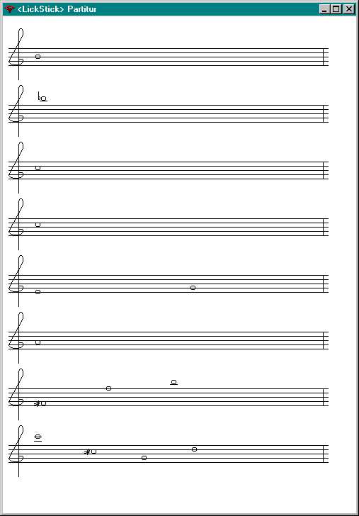 A score may be generated, for orientational purposes- by the very same program in real time. Switch on the score task. After exiting the programm, a binary score file will be found on disk in de lickstick directory. This file should be converted to standard midi by our H2M.EXE utility program. The result can then be converted to a score by programs such as Sibelius, Finale or even CakeWalk.