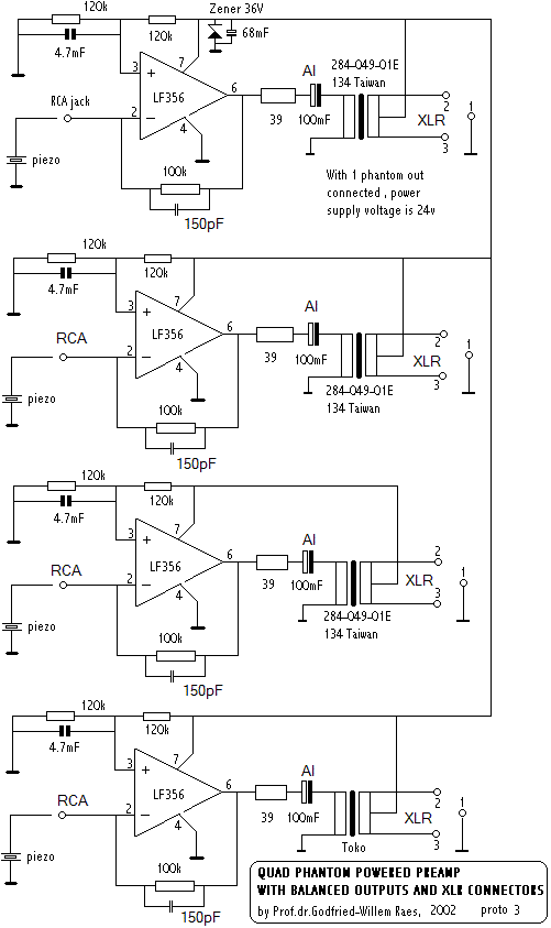 De opgebouwde 4-kanaals voorversterker met fantoomvoeding ziet eruit alsvolgt: