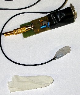 Een van de transducers met toebehoren (in dit geval een enkelvoudige fantoomgevoede voorversterker en een losse latex handschoenvinger) zijn hier afgebeeld: