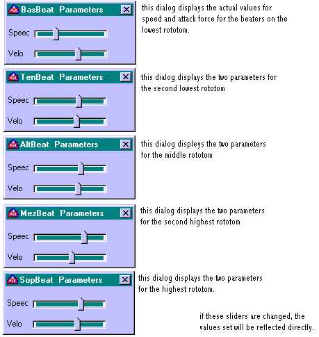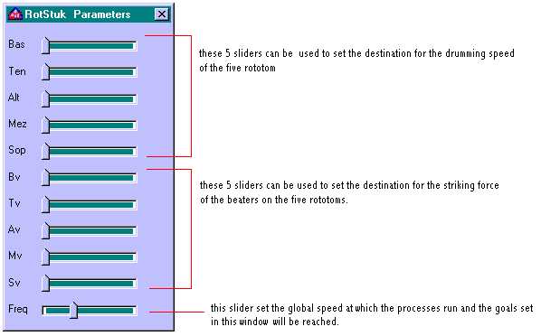 1. een dialoog venster met 11 sliders. Hiereen worden de doelwaarden ingesteld voor de tempi en dynamiek van de vijf rototoms. De bovenste vijf sliders laten toe het gewenste doeltempo in te stellen, de volgende vijf hebben betrekking op de dynamiek waarmee de trommels worden aangeslagen. De laatste regelt de globale snelheid waarmee de verglijdingsprocessen zullen plaatsgrijpen.