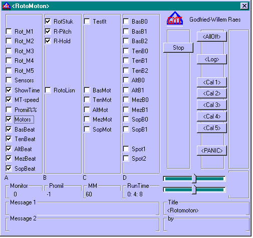 Na opstarten van <GMT> moet Rotomoton worden geselekteerd. Wanneer de cockpit verschijnt moet het stuk, in casu <Rotstuk> worden geselekteerd. Daarna mag (het moet niet onmiddellijk, R-Pitch worden gestart). Deze taak aktiveert de motorbewegingen en daarmee de toonhoogteveranderingen van de trommels.