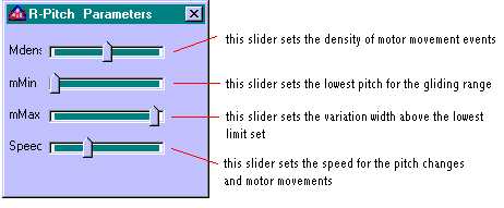 3. een dialoogvenster met kontrolemogelijkheden met betrekking tot de motor -en dus toonhoogte- bewegingen en hun verloop in het stuk. De eerste slider laat toe de densiteit in te stellen van de motorbewegingen, terwijl de laatste slider een kontrole toelaat over de snelheid waarmee de evolutieprocessen verlopen. De tweede slider regelt de ondergrens voor de motoren (dus de laagste toonhoogte tot dewelke de stemming zal kunnen zakken), de derde de hoogste toon boven de ondergrens waarheen de motor de trom zal kunnen laten draaien.